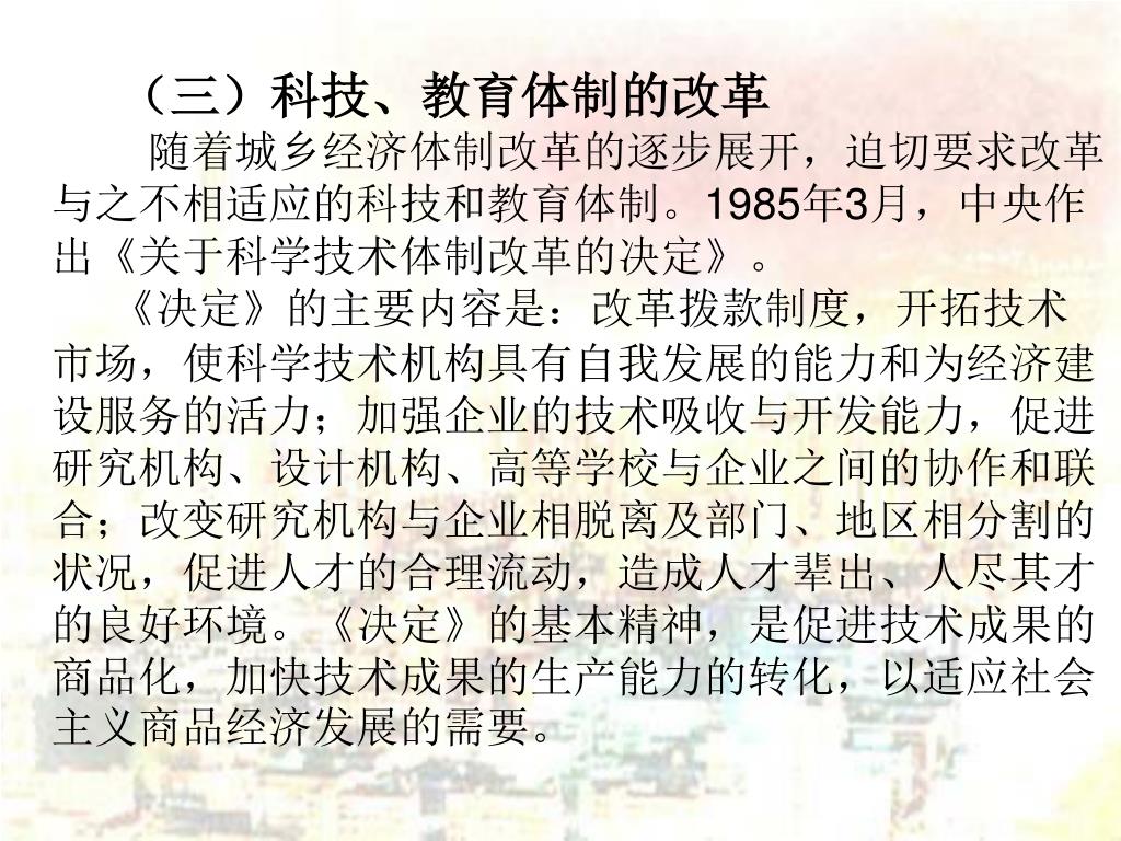 (三)科技、教育体制的改革 随着城乡经济体制改革的逐步展开,迫切要求改革与之不相适应的科技和教育体制。1985年3月,中央作出《关于科学技术体制改革的决定》。 《决定》的主要内容是:改革拨款制度,开拓技术市场,使科学技术机构具有自我发展的能力和为经济建设服务的活力;加强企业的技术吸收与开发能力,促进研究机构、设计机构、高等学校与企业之间的协作和联合;改变研究机构与企业相脱离及部门、地区相分割的状况,促进人才的合理流动,造成人才辈出、人尽其才的良好环境。《决定》的基本精神,是促进技术成果的商品化,加快技术成果的生产能力的转化,以适应社会主义商品经济发展的需要。