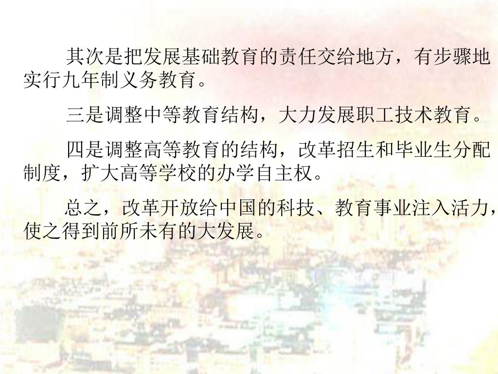 其次是把发展基础教育的责任交给地方,有步骤地实行九年制义务教育。其次是把发展基础教育的责任交给地方,有步骤地实行九年制义务教育。 三是调整中等教育结构,大力发展职工技术教育。 四是调整高等教育的结构,改革招生和毕业生分配制度,扩大高等学校的办学自主权。 总之,改革开放给中国的科技、教育事业注入活力,使之得到前所未有的大发展。