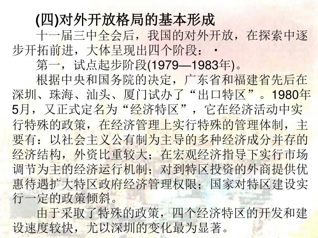 (四)对外开放格局的基本形成 十一届三中全会后,我国的对外开放,在探索中逐步开拓前进,大体呈现出四个阶段: 第一,试点起步阶段(1979—1983年)。 根据中央和国务院的决定,广东省和福建省先后在深圳、珠海、汕头、厦门试办了“出口特区”。1980年5月,又正式定名为“经济特区”,它在经济活动中实行特殊的政策,在经济管理上实行特殊的管理体制,主要有:以社会主义公有制为主导的多种经济成分并存的经济结构,外资比重较大;在宏观经济指导下实行市场调节为主的经济运行机制;对到特区投资的外商提供优惠待遇扩大特区政府经济管理权限;国家对特区建设实行一定的政策倾斜。 由于采取了特殊的政策,四个经济特区的开发和建设速度较快,尤以深圳的变化最为显著。