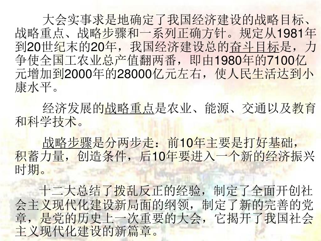 大会实事求是地确定了我国经济建设的战略目标、战略重点、战略步骤和一系列正确方针。规定从1981年到20世纪末的20年,我国经济建设总的奋斗目标是,力争使全国工农业总产值翻两番,即由1980年的7100亿元增加到2000年的28000亿元左右,使人民生活达到小康水平。大会实事求是地确定了我国经济建设的战略目标、战略重点、战略步骤和一系列正确方针。规定从1981年到20世纪末的20年,我国经济建设总的奋斗目标是,力争使全国工农业总产值翻两番,即由1980年的7100亿元增加到2000年的28000亿元左右,使人民生活达到小康水平。 经济发展的战略重点是农业、能源、交通以及教育和科学技术。 战略步骤是分两步走:前10年主要是打好基础,积蓄力量,创造条件,后10年要进入一个新的经济振兴时期。 十二大总结了拨乱反正的经验,制定了全面开创社会主义现代化建设新局面的纲领,制定了新的完善的党章,是党的历史上一次重要的大会,它揭开了我国社会主义现代化建设的新篇章。