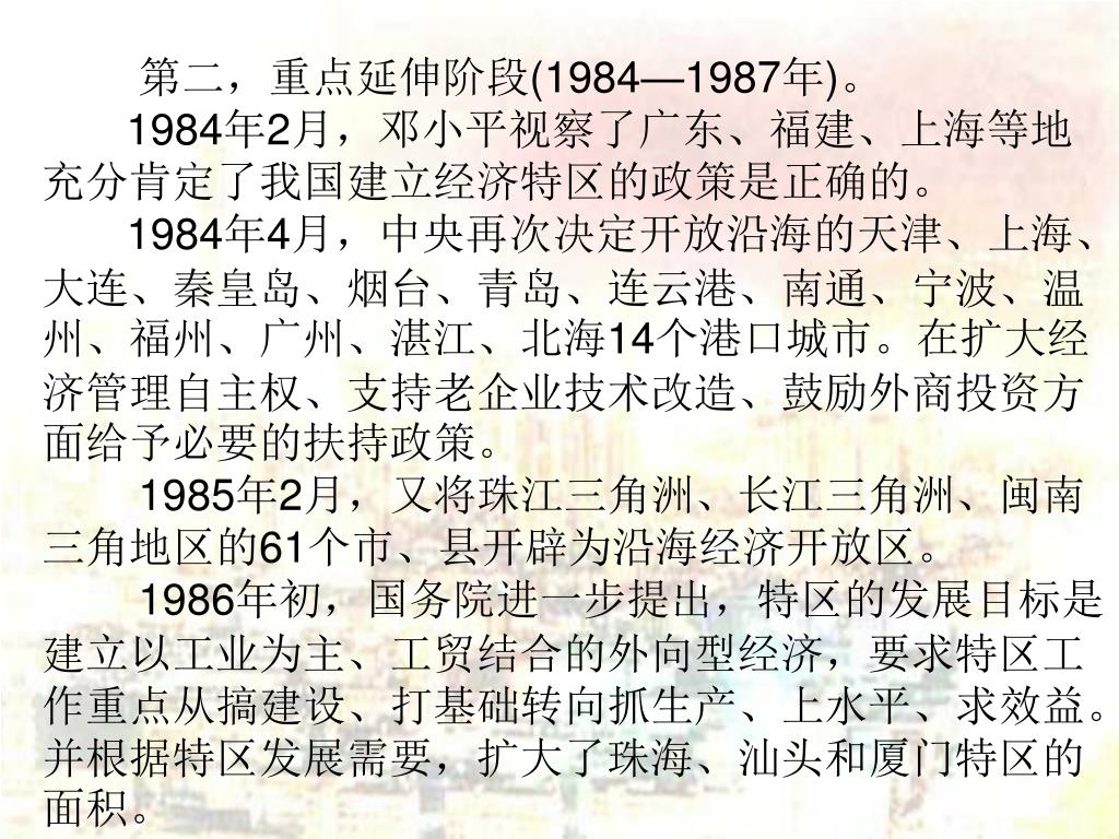 第二,重点延伸阶段(1984—1987年)。 1984年2月,邓小平视察了广东、福建、上海等地充分肯定了我国建立经济特区的政策是正确的。 1984年4月,中央再次决定开放沿海的天津、上海、大连、秦皇岛、烟台、青岛、连云港、南通、宁波、温州、福州、广州、湛江、北海14个港口城市。在扩大经济管理自主权、支持老企业技术改造、鼓励外商投资方面给予必要的扶持政策。 1985年2月,又将珠江三角洲、长江三角洲、闽南三角地区的61个市、县开辟为沿海经济开放区。 1986年初,国务院进一步提出,特区的发展目标是建立以工业为主、工贸结合的外向型经济,要求特区工作重点从搞建设、打基础转向抓生产、上水平、求效益。并根据特区发展需要,扩大了珠海、汕头和厦门特区的面积。