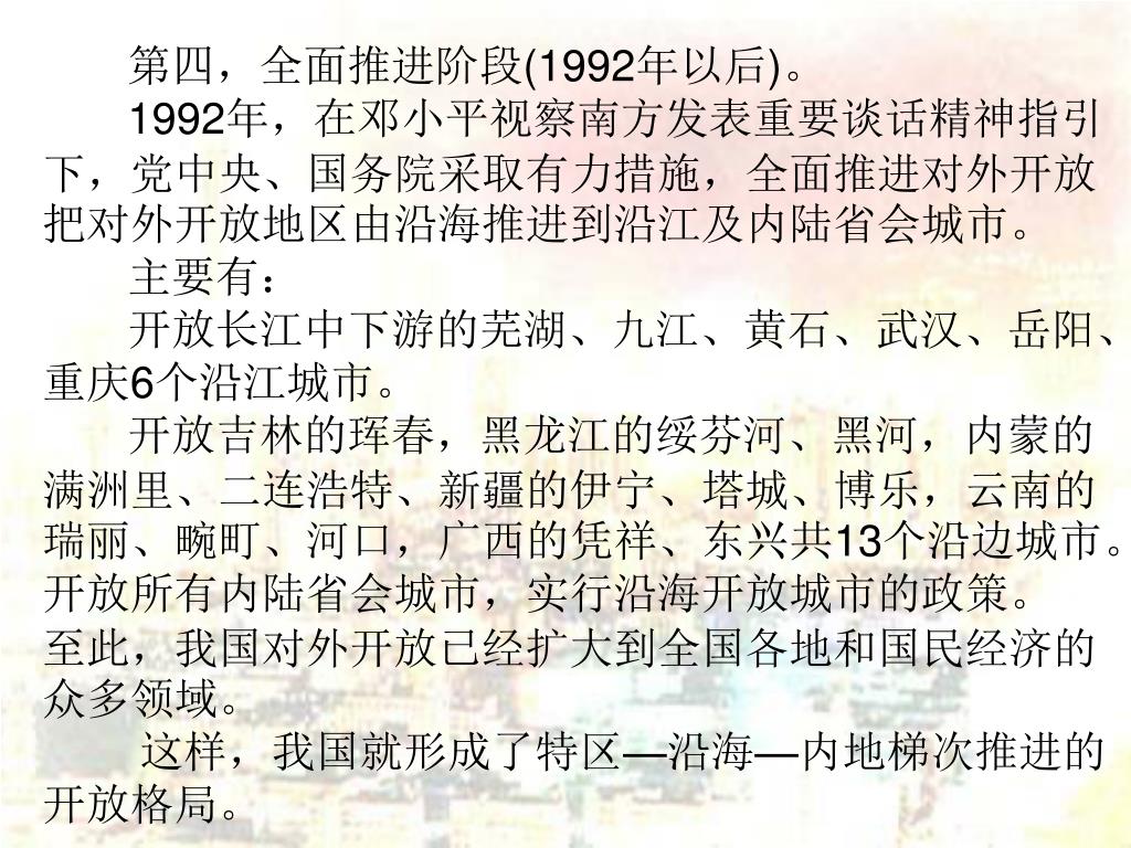 第四,全面推进阶段(1992年以后)。 1992年,在邓小平视察南方发表重要谈话精神指引下,党中央、国务院采取有力措施,全面推进对外开放把对外开放地区由沿海推进到沿江及内陆省会城市。 主要有: 开放长江中下游的芜湖、九江、黄石、武汉、岳阳、重庆6个沿江城市。 开放吉林的珲春,黑龙江的绥芬河、黑河,内蒙的满洲里、二连浩特、新疆的伊宁、塔城、博乐,云南的瑞丽、畹町、河口,广西的凭祥、东兴共13个沿边城市。 开放所有内陆省会城市,实行沿海开放城市的政策。 至此,我国对外开放已经扩大到全国各地和国民经济的众多领域。 这样,我国就形成了特区—沿海—内地梯次推进的开放格局。
