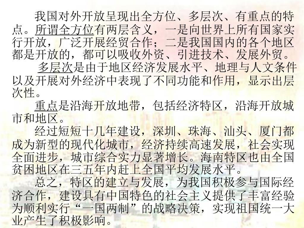 我国对外开放呈现出全方位、多层次、有重点的特点。所谓全方位有两层含义,一是向世界上所有国家实行开放,广泛开展经贸合作;二是我国国内的各个地区都是开放的,都可以吸收外资、引进技术、发展外贸。 多层次是由于地区经济发展水平、地理与人文条件以及开展对外经济中表现了不同功能和作用,显示出层次性。 重点是沿海开放地带,包括经济特区,沿海开放城市和地区。 经过短短十几年建设,深圳、珠海、汕头、厦门都成为新型的现代化城市,经济持续高速发展,社会实现全面进步,城市综合实力显著增长。海南特区也由全国贫困地区在三五年内赶上全国平均发展水平。 总之,特区的建立与发展,为我国积极参与国际经济合作,建设具有中国特色的社会主义提供了丰富经验为顺利实行“一国两制”的战略决策,实现祖国统一大业产生了积极影响。