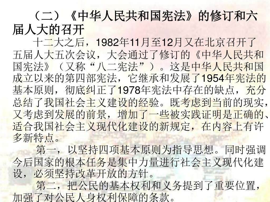 (二)《中华人民共和国宪法》的修订和六届人大的召开(二)《中华人民共和国宪法》的修订和六届人大的召开 十二大之后,1982年11月至12月又在北京召开了五届人大五次会议,大会通过了修订的《中华人民共和国宪法》(又称“八二宪法”)。这是中华人民共和国成立以来的第四部宪法,它继承和发展了1954年宪法的基本原则,彻底纠正了1978年宪法中存在的缺点,充分总结了我国社会主义建设的经验。既考虑到当前的现实,又考虑到发展的前景,增加了一些被实践证明是正确的、适合我国社会主义现代化建设的新规定,在内容上有许多新特点。 第一,以坚持四项基本原则为指导思想。同时强调今后国家的根本任务是集中力量进行社会主义现代化建设,必须坚持改革开放的方针。 第二,把公民的基本权利和义务提到了重要位置,加强了对公民人身权利保障的条款。