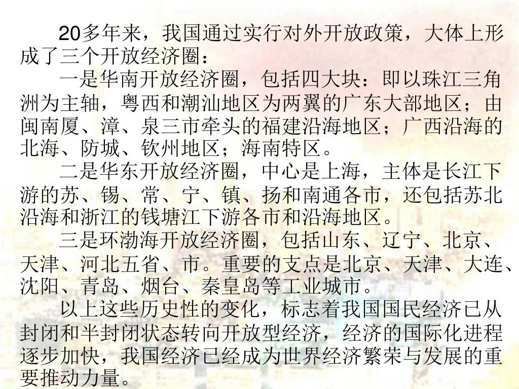 20多年来,我国通过实行对外开放政策,大体上形成了三个开放经济圈: 一是华南开放经济圈,包括四大块:即以珠江三角洲为主轴,粤西和潮汕地区为两翼的广东大部地区;由闽南厦、漳、泉三市牵头的福建沿海地区;广西沿海的北海、防城、钦州地区;海南特区。 二是华东开放经济圈,中心是上海,主体是长江下游的苏、锡、常、宁、镇、扬和南通各市,还包括苏北沿海和浙江的钱塘江下游各市和沿海地区。 三是环渤海开放经济圈,包括山东、辽宁、北京、天津、河北五省、市。重要的支点是北京、天津、大连、沈阳、青岛、烟台、秦皇岛等工业城市。 以上这些历史性的变化,标志着我国国民经济已从封闭和半封闭状态转向开放型经济,经济的国际化进程逐步加快,我国经济已经成为世界经济繁荣与发展的重要推动力量。