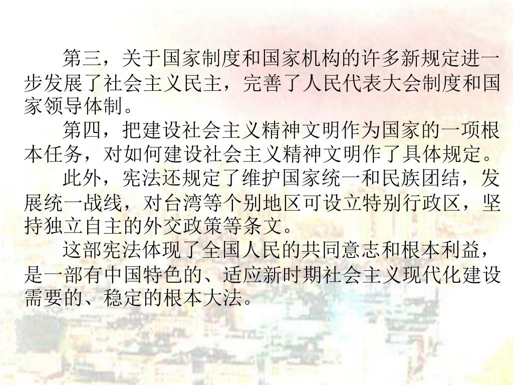 第三,关于国家制度和国家机构的许多新规定进一步发展了社会主义民主,完善了人民代表大会制度和国家领导体制。第三,关于国家制度和国家机构的许多新规定进一步发展了社会主义民主,完善了人民代表大会制度和国家领导体制。 第四,把建设社会主义精神文明作为国家的一项根本任务,对如何建设社会主义精神文明作了具体规定。 此外,宪法还规定了维护国家统一和民族团结,发展统一战线,对台湾等个别地区可设立特别行政区,坚持独立自主的外交政策等条文。 这部宪法体现了全国人民的共同意志和根本利益,是一部有中国特色的、适应新时期社会主义现代化建设需要的、稳定的根本大法。