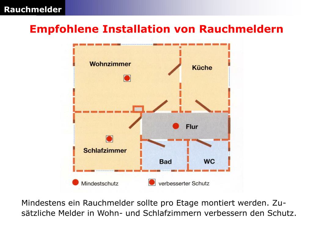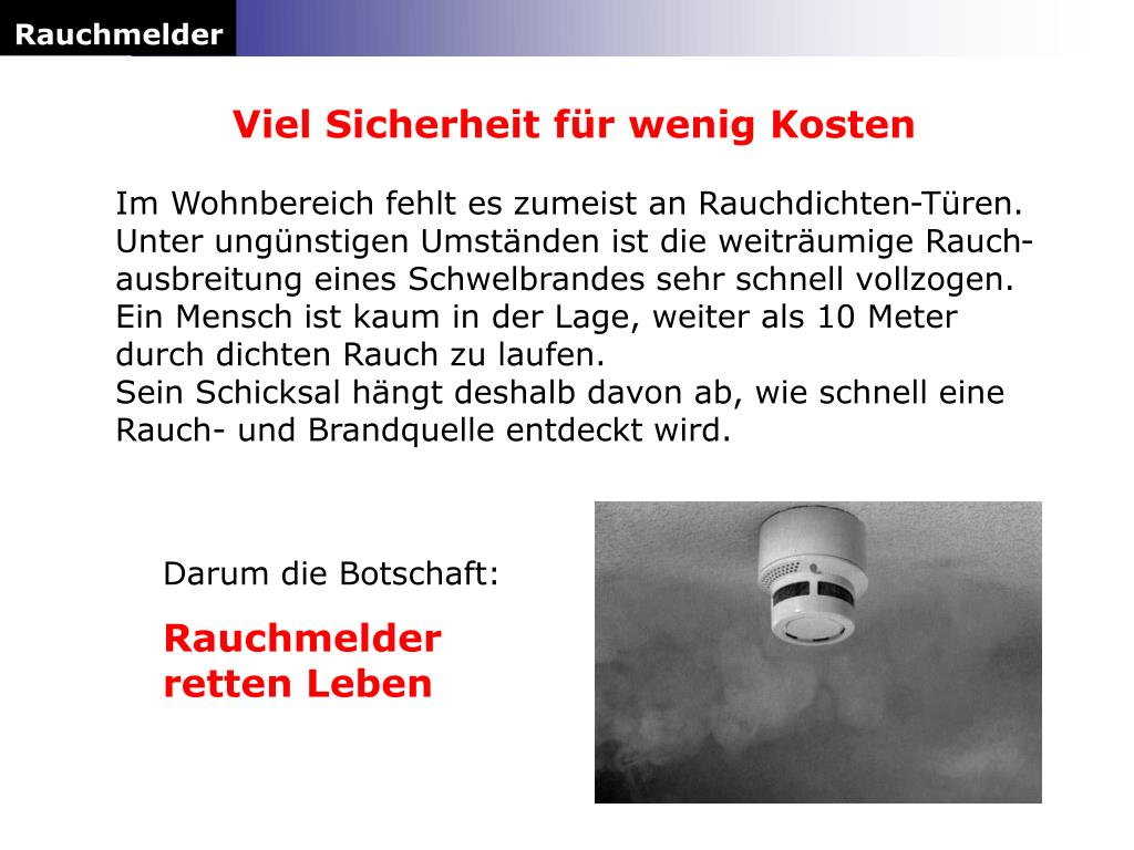 Rauchmelder Viel Sicherheit für wenig Kosten Im Wohnbereich fehlt es zumeist an Rauchdichten-Türen. Unter ungünstigen Umständen ist die weiträumige Rauch-ausbreitung eines Schwelbrandes sehr schnell vollzogen. Ein Mensch ist kaum in der Lage, weiter als 10 Meter durch dichten Rauch zu laufen. Sein Schicksal hängt deshalb davon ab, wie schnell eine Rauch- und Brandquelle entdeckt wird. Darum die Botschaft: Rauchmelder retten Leben