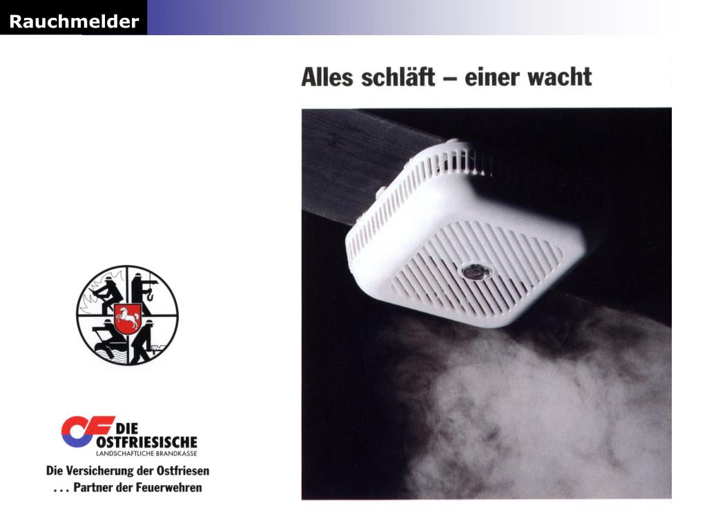 Rauchmelder Brandstatistik Vier Fünftel der Brände entstehen in Privathaushalten, nicht in der Industrie- oder Gewerbebetriebe Nur 7 Prozent aller deutschen Haushalte sind mit Rauchmeldern ausgestattet. In Großbritannien und Schweden sind es 75 bzw. 70 Prozent. Durch die Gemeinschaftsaktion der Ostfriesischen Feuerwehren und der Ostfriesischen Landschaftlichen Brandkasse „Rauchmelder retten Leben“ sind in Ostfriesland 70 Prozent der Haushalte mit Rauchmeldern ausgestattet.
