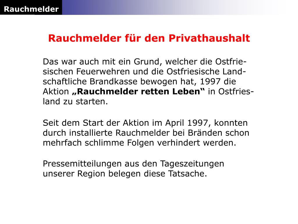 Rauchmelder Rauchmelder für den Privathaushalt Das war auch mit ein Grund, welcher die Ostfrie-sischen Feuerwehren und die Ostfriesische Land-schaftliche Brandkasse bewogen hat, 1997 die Aktion „Rauchmelder retten Leben“ in Ostfries-land zu starten. Seit dem Start der Aktion im April 1997, konnten durch installierte Rauchmelder bei Bränden schon mehrfach schlimme Folgen verhindert werden. Pressemitteilungen aus den Tageszeitungen unserer Region belegen diese Tatsache.