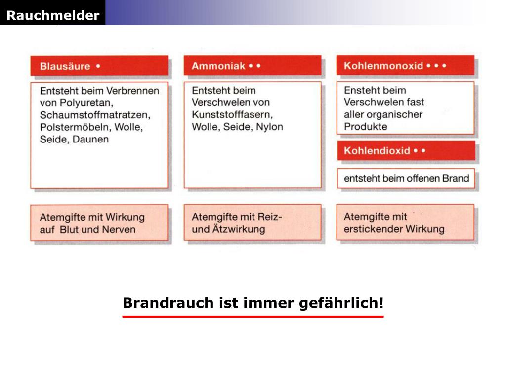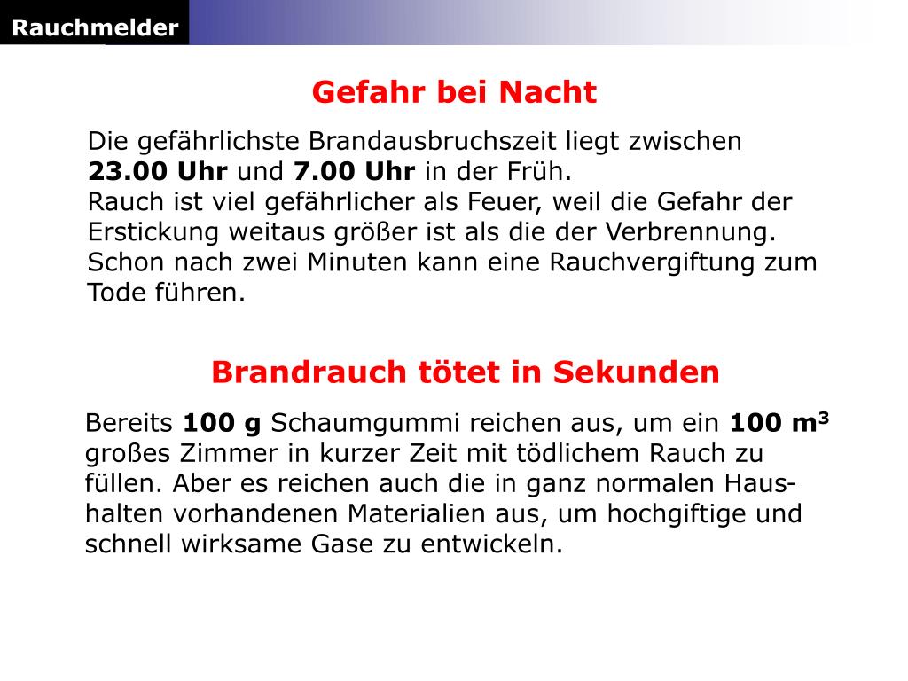 Rauchmelder Gefahr bei Nacht Die gefährlichste Brandausbruchszeit liegt zwischen 23.00 Uhr und 7.00 Uhr in der Früh. Rauch ist viel gefährlicher als Feuer, weil die Gefahr der Erstickung weitaus größer ist als die der Verbrennung. Schon nach zwei Minuten kann eine Rauchvergiftung zum Tode führen. Brandrauch tötet in Sekunden Bereits 100 g Schaumgummi reichen aus, um ein 100 m3 großes Zimmer in kurzer Zeit mit tödlichem Rauch zu füllen. Aber es reichen auch die in ganz normalen Haus-halten vorhandenen Materialien aus, um hochgiftige und schnell wirksame Gase zu entwickeln.