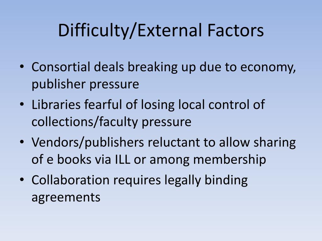 Difficulty/External Factors • Consortial deals breaking up due to economy, publisher pressure • Libraries fearful of losing local control of collections/faculty pressure • Vendors/publishers reluctant to allow sharing of e books via ILL or among membership • Collaboration requires legally binding agreements
