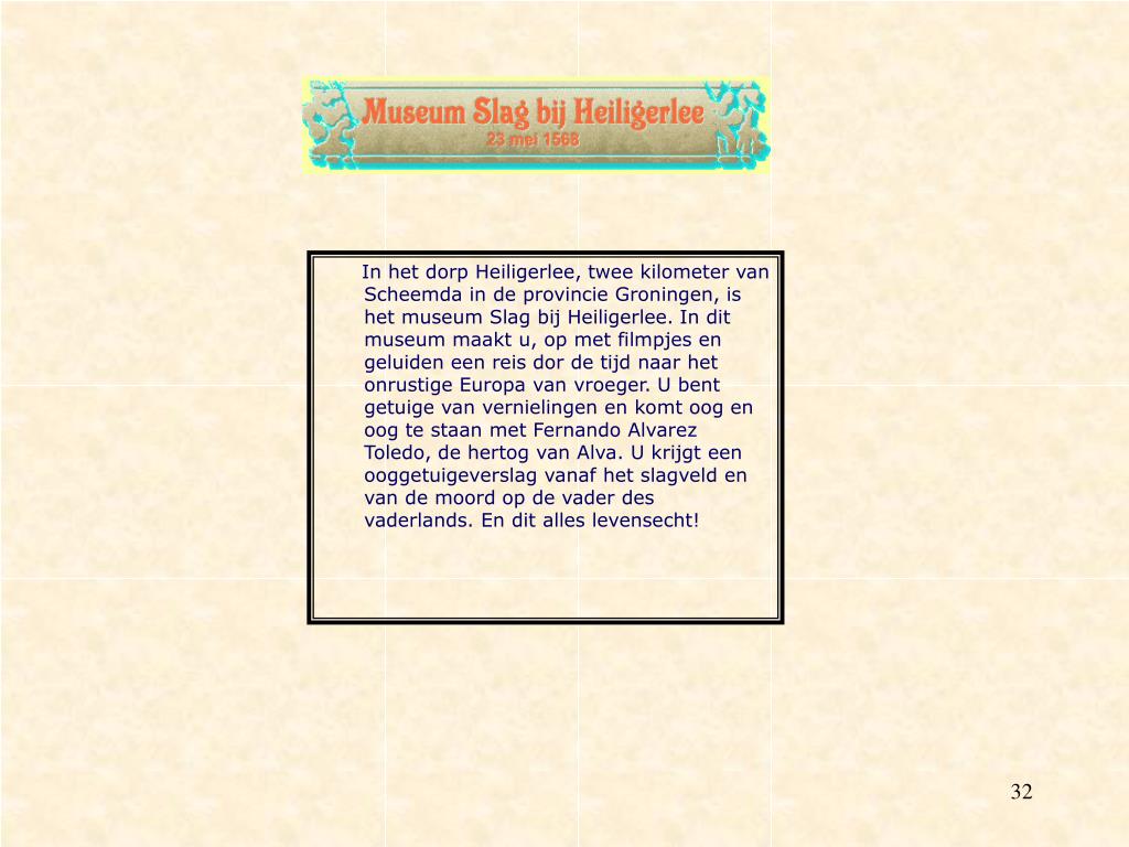 In het dorp Heiligerlee, twee kilometer van Scheemda in de provincie Groningen, is het museum Slag bij Heiligerlee. In dit museum maakt u, op met filmpjes en geluiden een reis dor de tijd naar het onrustige Europa van vroeger. U bent getuige van vernielingen en komt oog en oog te staan met Fernando Alvarez Toledo, de hertog van Alva. U krijgt een ooggetuigeverslag vanaf het slagveld en van de moord op de vader des vaderlands. En dit alles levensecht!
