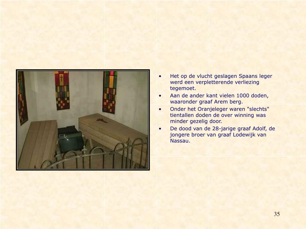 Het op de vlucht geslagen Spaans leger werd een verpletterende verliezing tegemoet. • Aan de ander kant vielen 1000 doden, waaronder graaf Arem berg. • Onder het Oranjeleger waren "slechts" tientallen doden de over winning was minder gezelig door. • De dood van de 28-jarige graaf Adolf, de jongere broer van graaf Lodewijk van Nassau.