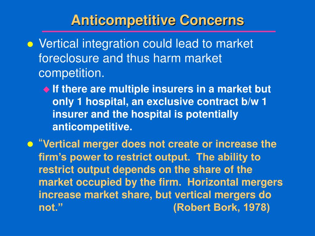 Anticompetitive Concerns • Vertical integration could lead to market foreclosure and thus harm market competition. • If there are multiple insurers in a market but only 1 hospital, an exclusive contract b/w 1 insurer and the hospital is potentially anticompetitive. • “Vertical merger does not create or increase the firm’s power to restrict output. The ability to restrict output depends on the share of the market occupied by the firm. Horizontal mergers increase market share, but vertical mergers do not.” (Robert Bork, 1978)