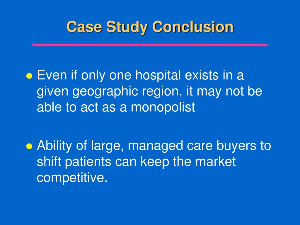 Case Study Conclusion • Even if only one hospital exists in a given geographic region, it may not be able to act as a monopolist • Ability of large, managed care buyers to shift patients can keep the market competitive.