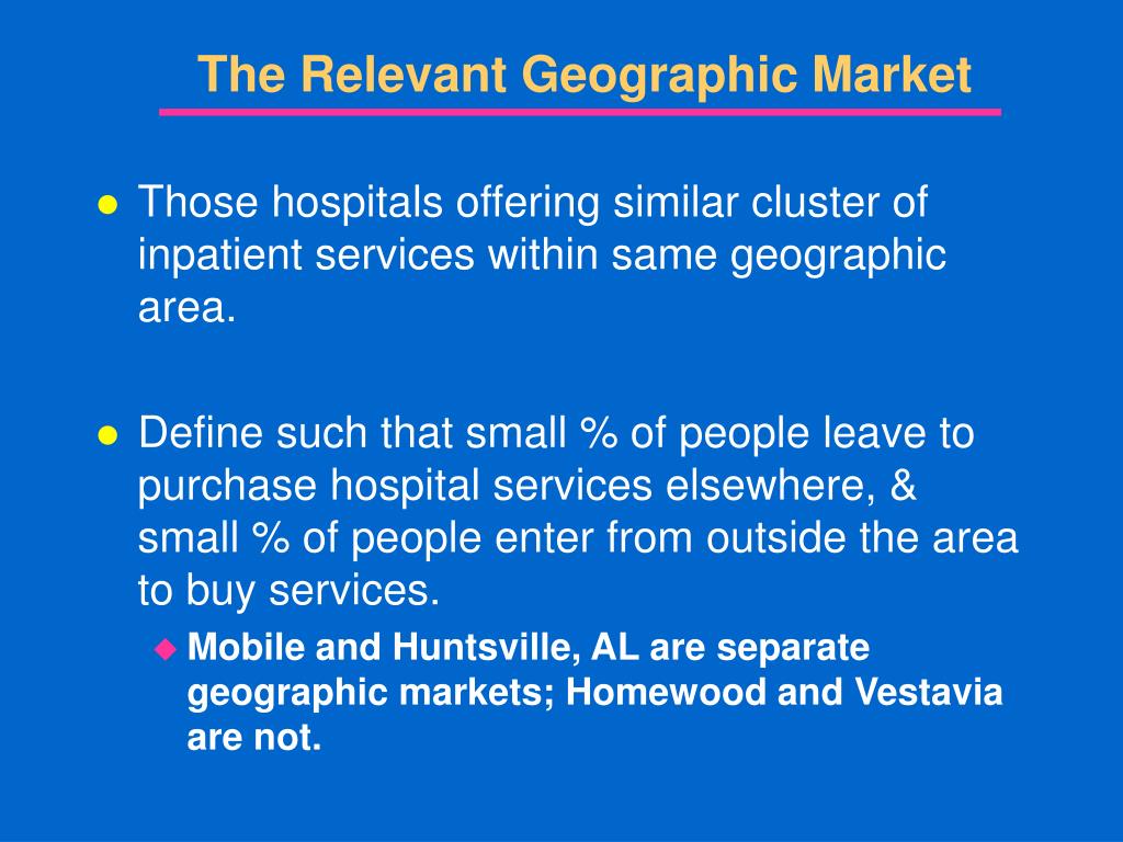 The Relevant Geographic Market • Those hospitals offering similar cluster of inpatient services within same geographic area. • Define such that small % of people leave to purchase hospital services elsewhere, & small % of people enter from outside the area to buy services. • Mobile and Huntsville, AL are separate geographic markets; Homewood and Vestavia are not.