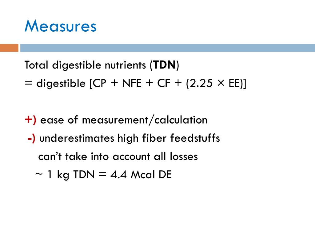 Measures Total digestible nutrients (TDN) = digestible [CP + NFE + CF + (2.25 × EE)] +) ease of measurement/calculation -)underestimates high fiber feedstuffs can’t take into account all losses ~ 1 kg TDN = 4.4 Mcal DE