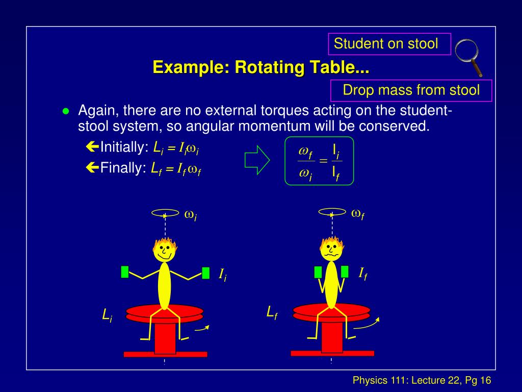 Student on stool Example: Rotating Table... Drop mass from stool • Again, there are no external torques acting on the student-stool system, so angular momentum will be conserved. • Initially: Li = Iii • Finally: Lf = If f f i If Ii Lf Li
