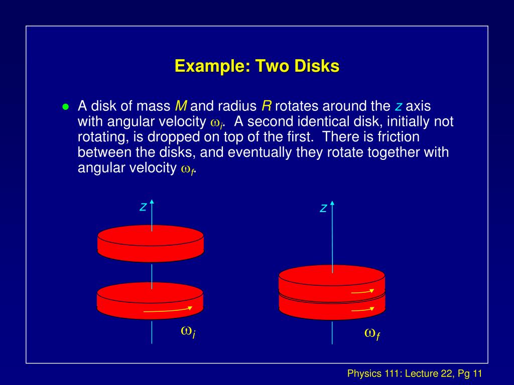z z f Example: Two Disks • A disk of mass M and radius R rotates around the z axis with angular velocity i. A second identical disk, initially not rotating, is dropped on top of the first. There is friction between the disks, and eventually they rotate together with angular velocity f. i