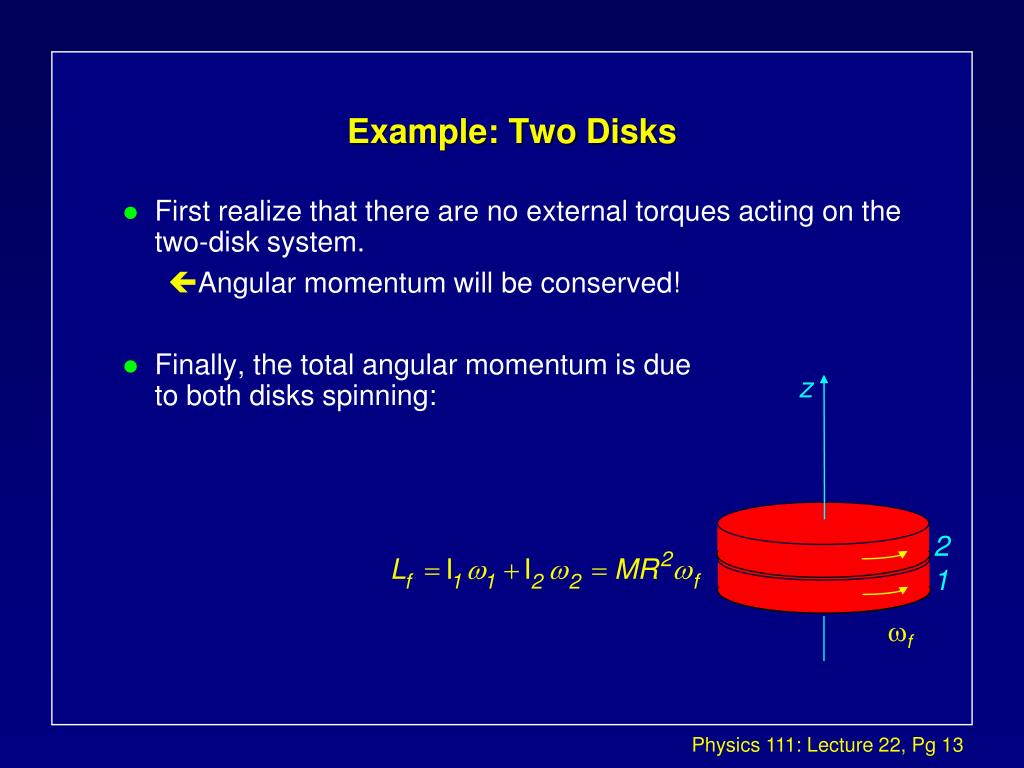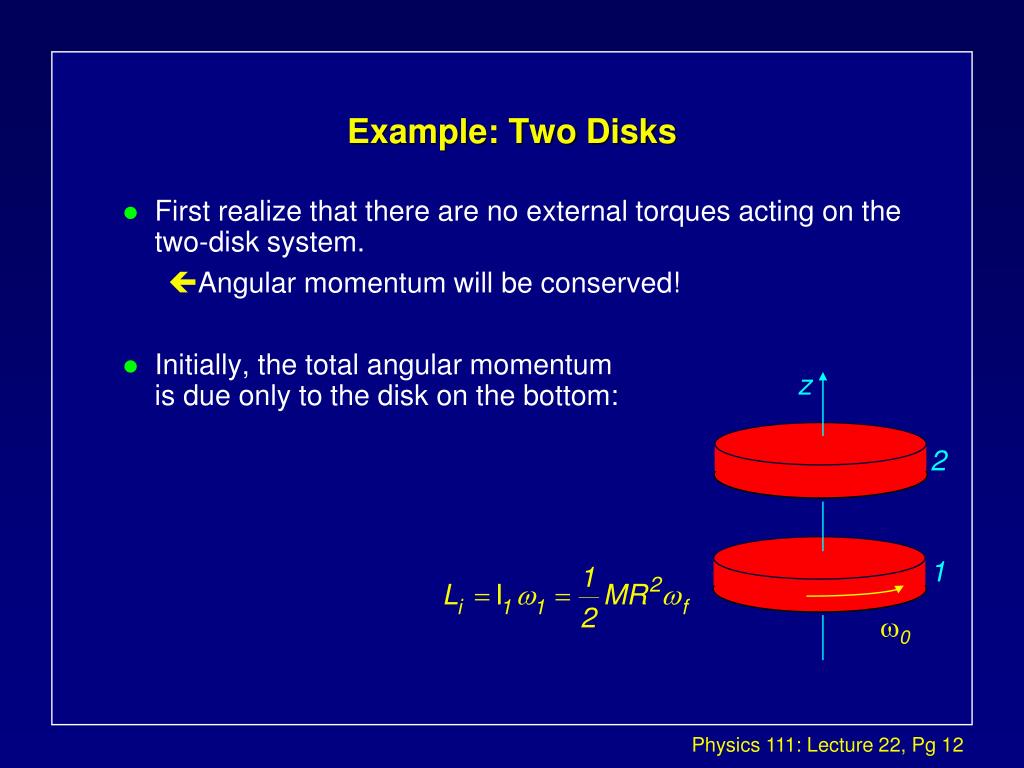 z Example: Two Disks • First realize that there are no external torques acting on the two-disk system. • Angular momentum will be conserved! • Initially, the total angular momentum is due only to the disk on the bottom: 2 1 0