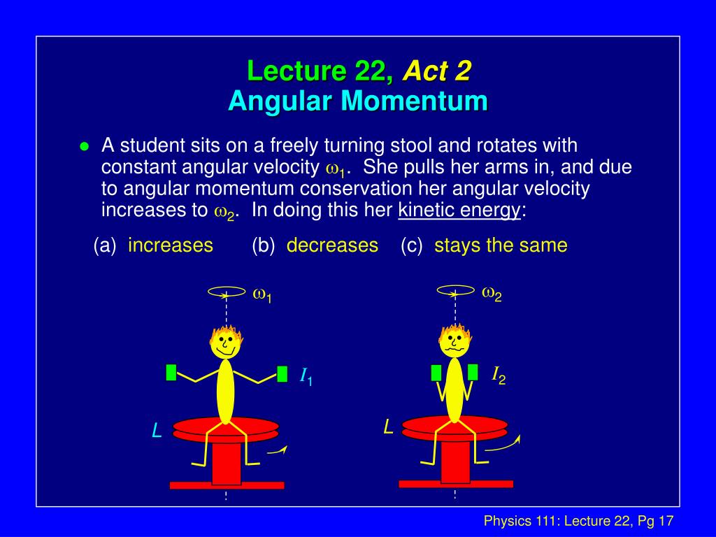 Lecture 22, Act 2Angular Momentum • A student sits on a freely turning stool and rotates with constant angular velocity w1. She pulls her arms in, and due to angular momentum conservation her angular velocity increases to w2. In doing this her kinetic energy: (a) increases (b) decreases (c) stays the same w2 w1 I2 I1 L L