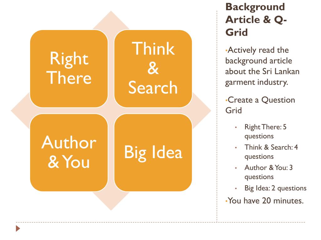 Background Article & Q-Grid Actively read the background article about the Sri Lankan garment industry. Create a Question Grid Right There: 5 questions Think & Search: 4 questions Author & You: 3 questions Big Idea: 2 questions You have 20 minutes.