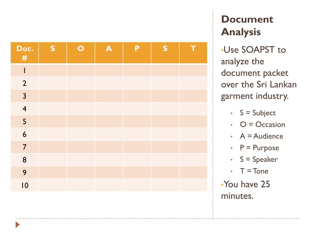 Document Analysis Use SOAPST to analyze the document packet over the Sri Lankan garment industry. S = Subject O = Occasion A = Audience P = Purpose S = Speaker T = Tone You have 25 minutes.