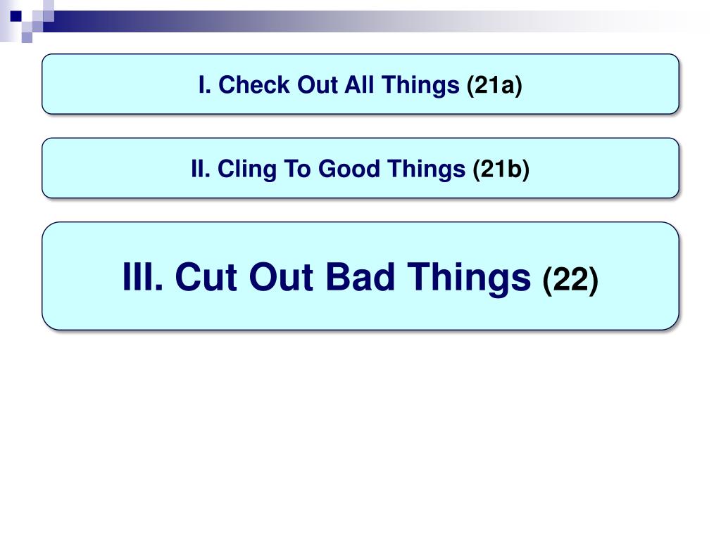 I. Check Out All Things (21a) II. Cling To Good Things (21b) III. Cut Out Bad Things (22)