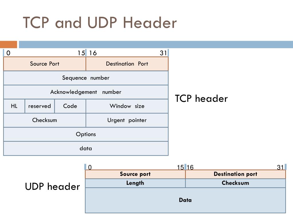 TCP and UDP Header 0 15 16 31 Source Port Destination Port Sequence number Acknowledgement number TCP header HL reserved Code Window size Checksum Urgent pointer Options data 0 15 16 31 Source port Destination port UDP header Length Checksum Data