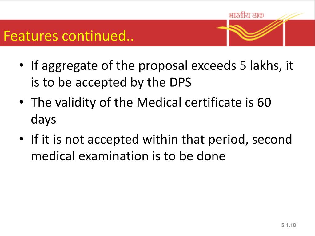 Features continued.. • If aggregate of the proposal exceeds 5 lakhs, it is to be accepted by the DPS • The validity of the Medical certificate is 60 days • If it is not accepted within that period, second medical examination is to be done
