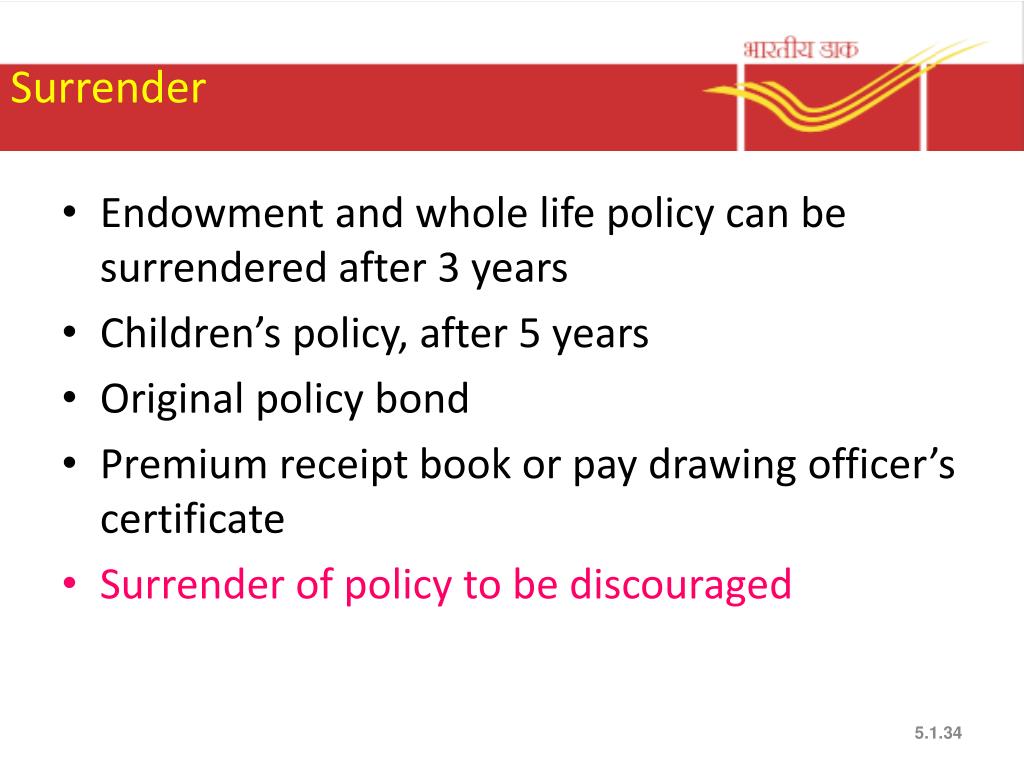 Surrender • Endowment and whole life policy can be surrendered after 3 years • Children’s policy, after 5 years • Original policy bond • Premium receipt book or pay drawing officer’s certificate • Surrender of policy to be discouraged