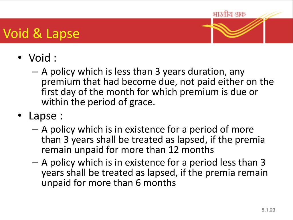 Void & Lapse • Void : • A policy which is less than 3 years duration, any premium that had become due, not paid either on the first day of the month for which premium is due or within the period of grace. • Lapse : • A policy which is in existence for a period of more than 3 years shall be treated as lapsed, if the premia remain unpaid for more than 12 months • A policy which is in existence for a period less than 3 years shall be treated as lapsed, if the premia remain unpaid for more than 6 months