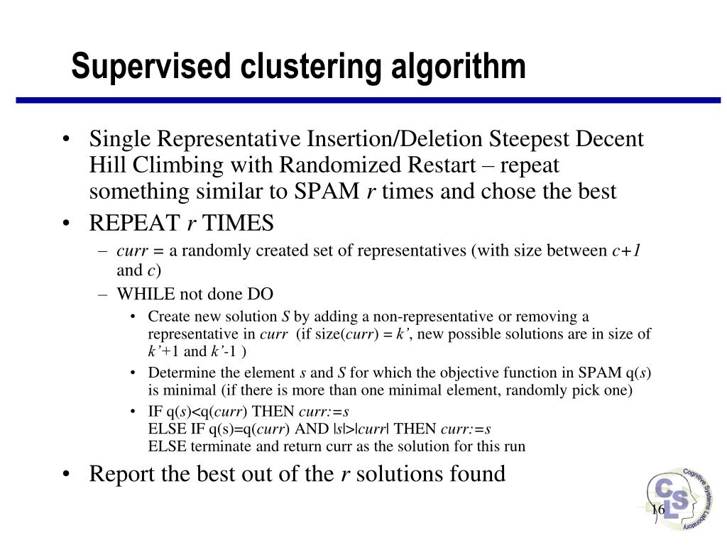 Supervised clustering algorithm • Single Representative Insertion/Deletion Steepest Decent Hill Climbing with Randomized Restart – repeat something similar to SPAM r times and chose the best • REPEAT r TIMES • curr = a randomly created set of representatives (with size between c+1 and c) • WHILE not done DO • Create new solution S by adding a non-representative or removing a representative in curr (if size(curr) = k’, new possible solutions are in size of k’+1 and k’-1 ) • Determine the element s and S for which the objective function in SPAM q(s) is minimal (if there is more than one minimal element, randomly pick one) • IF q(s)<q(curr) THEN curr:=sELSE IF q(s)=q(curr) AND |s|>|curr| THEN curr:=sELSE terminate and return curr as the solution for this run • Report the best out of the r solutions found