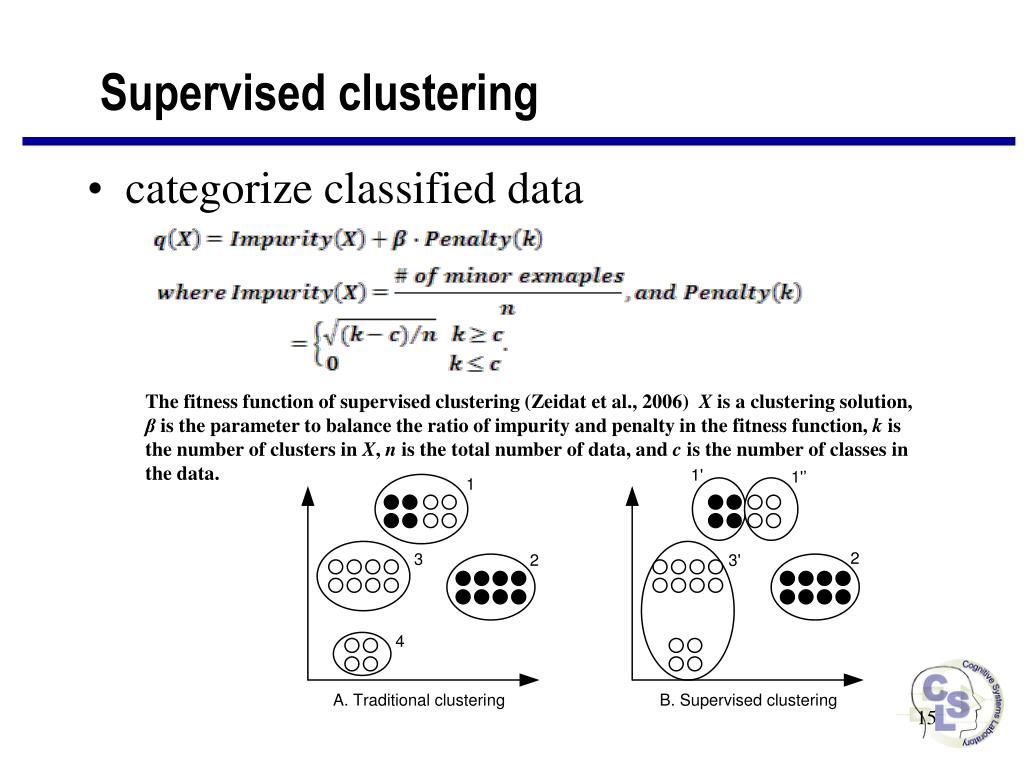 Supervised clustering The fitness function of supervised clustering (Zeidat et al., 2006) X is a clustering solution, β is the parameter to balance the ratio of impurity and penalty in the fitness function, k is the number of clusters in X, n is the total number of data, and c is the number of classes in the data. • categorize classified data