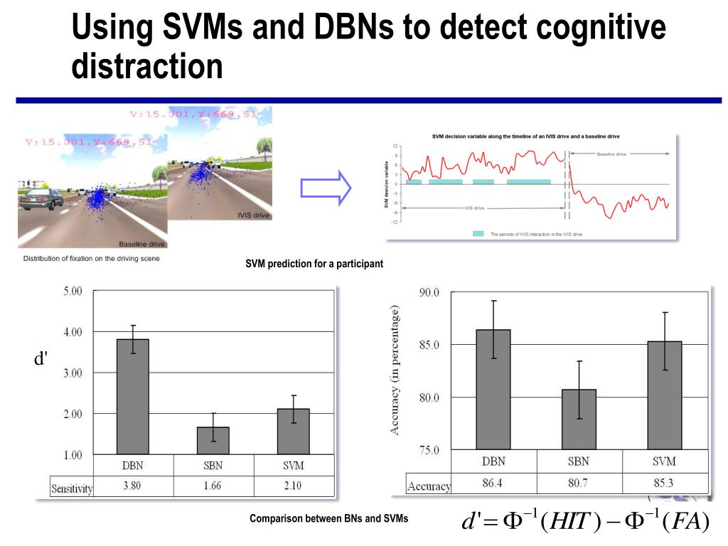 Using SVMs and DBNs to detect cognitive distraction SVM prediction for a participant d' Comparison between BNs and SVMs