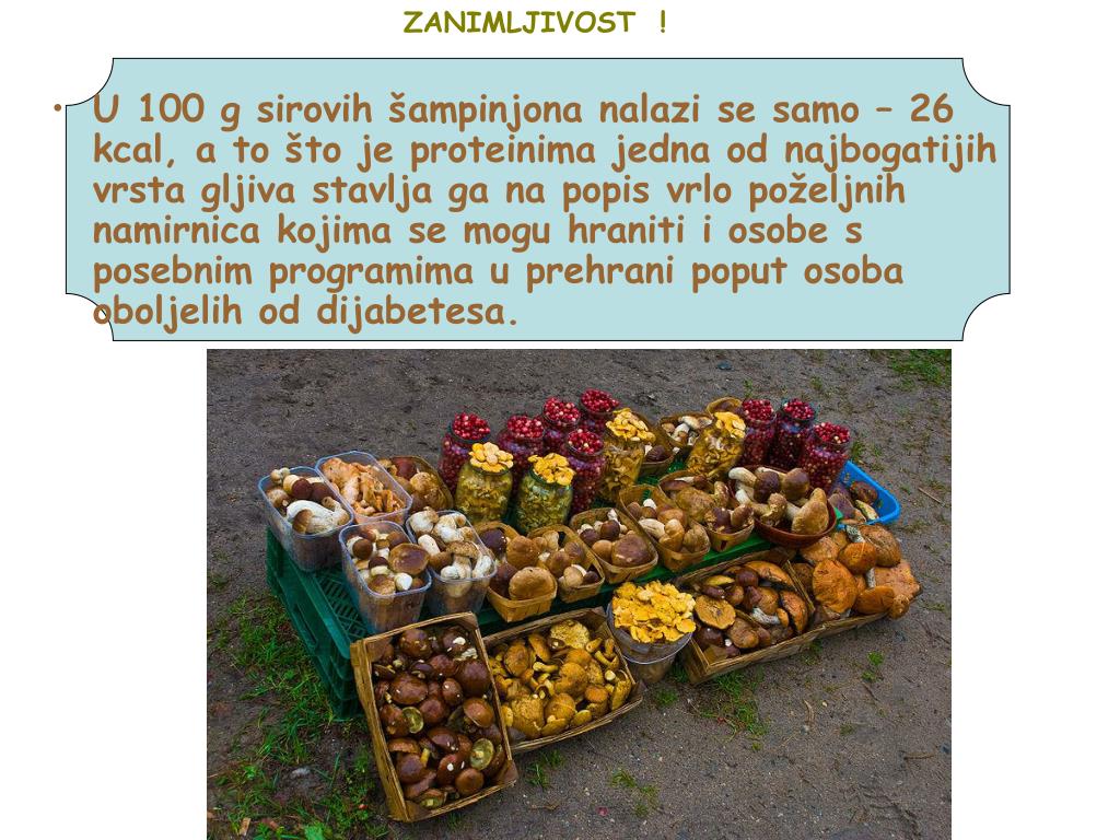 ZANIMLJIVOST ! • U 100 g sirovih šampinjona nalazi se samo – 26 kcal, a to što je proteinima jedna od najbogatijih vrsta gljiva stavlja ga na popis vrlo poželjnih namirnica kojima se mogu hraniti i osobe s posebnim programima u prehrani poput osoba oboljelih od dijabetesa.