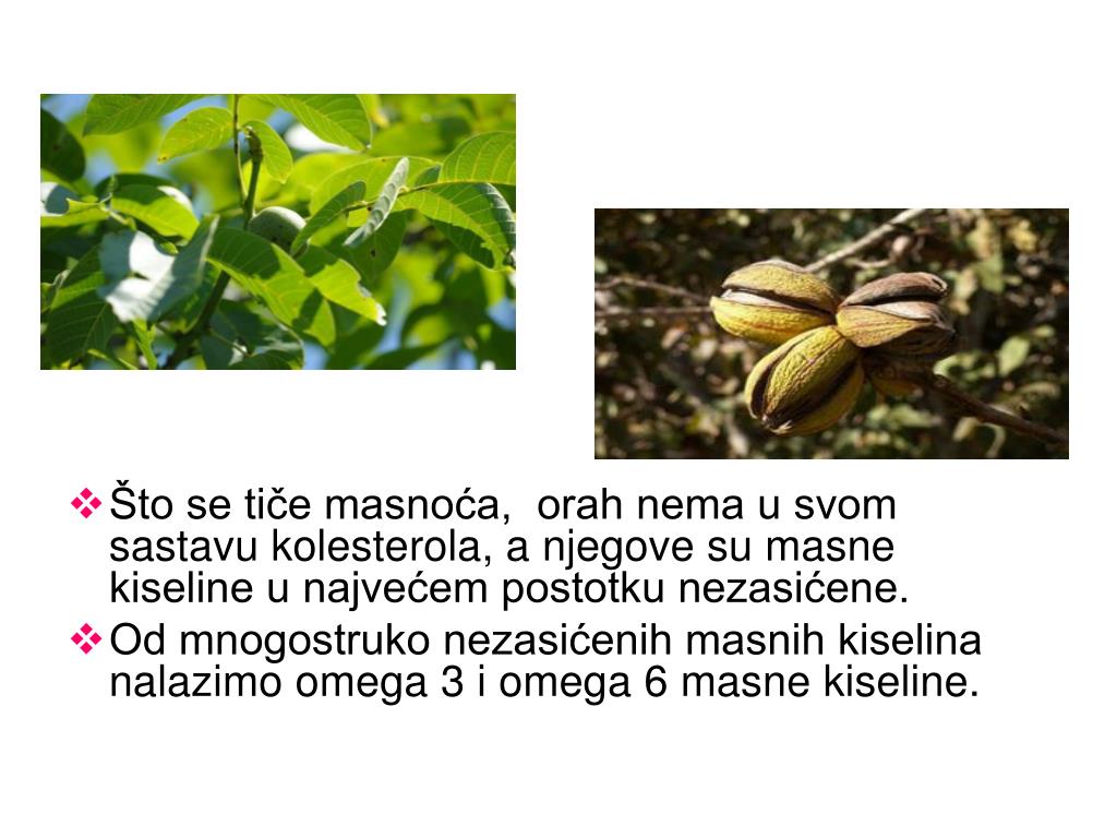 Što se tiče masnoća, orah nema u svom sastavu kolesterola, a njegove su masne kiseline u najvećem postotku nezasićene. • Od mnogostruko nezasićenih masnih kiselina nalazimo omega 3 i omega 6 masne kiseline.