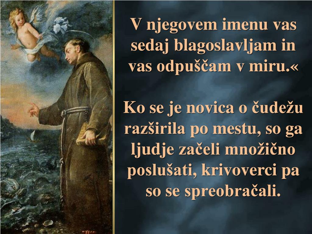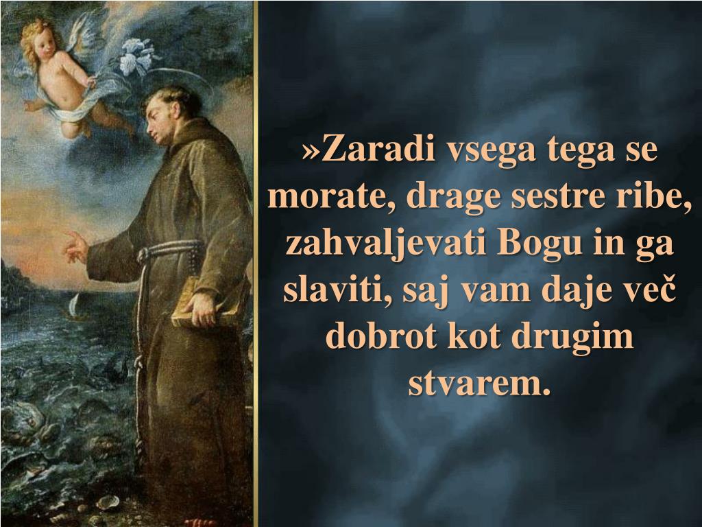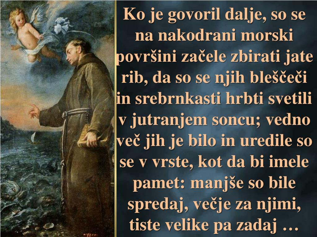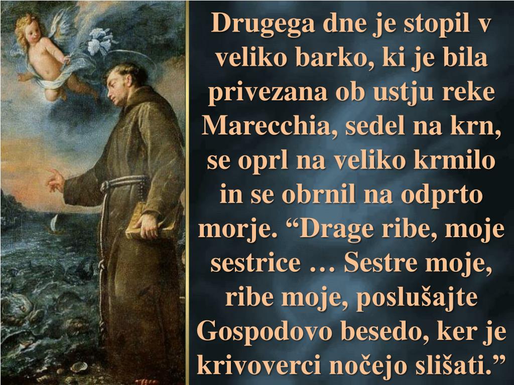 Drugegadne je stopil v velikobarko, ki je bilaprivezana ob ustjurekeMarecchia, sedelnakrn, se oprlnavelikokrmilo in se obrnilnaodprtomorje. “Drageribe, mojesestrice … Sestremoje, ribemoje, poslušajteGospodovobesedo, ker je krivovercinočejoslišati.”