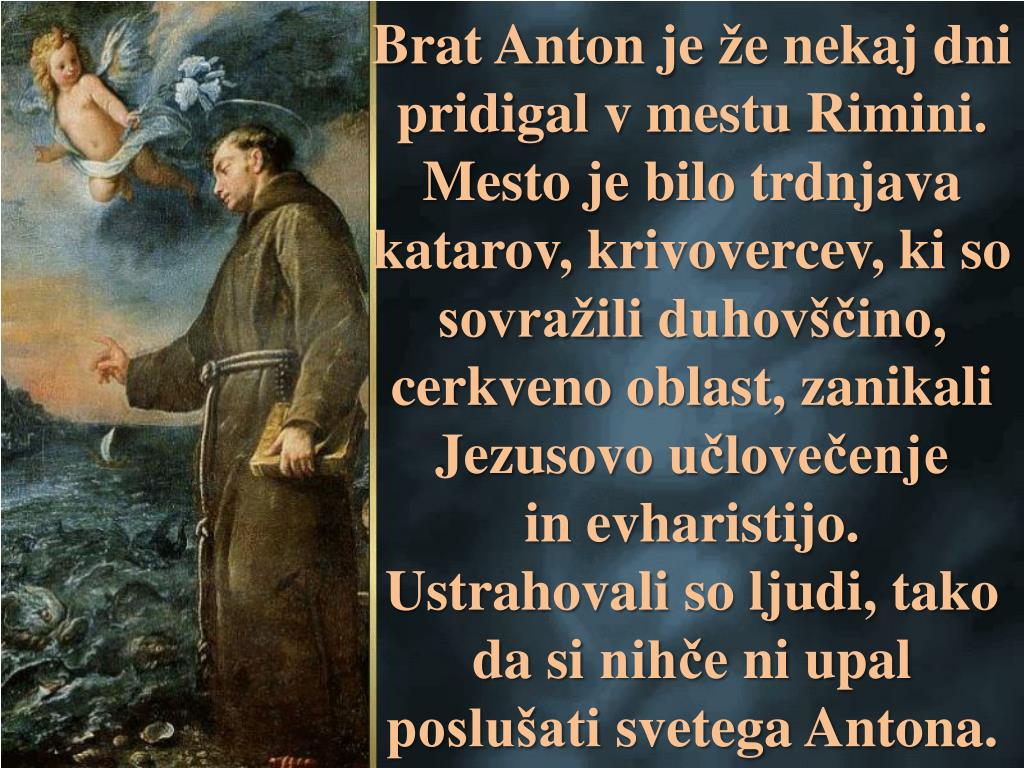 Brat Anton je ženekajdnipridigal v mestu Rimini. Mesto je bilotrdnjavakatarov, krivovercev, ki so sovražiliduhovščino, cerkveno oblast, zanikaliJezusovoučlovečenjein evharistijo. Ustrahovali so ljudi, takodasinihčeniupalposlušatisvetegaAntona.