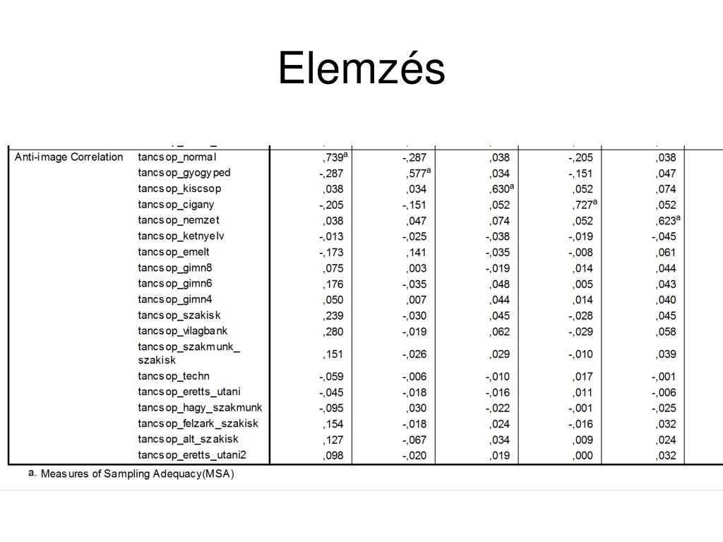 További segítségek • Korrelációs mátrix inverze: parciális korrelációk kiszámításához nyújt segítséget • Anti-Image korrelációs mátrix: főátlójában a változónként számolt KMO értékek szerepelnek, főátlóján kívül a parciális korrelációk • Reprodukált korrelációs mátrix: ennek fődiagonálisában vannak a kommunalitások