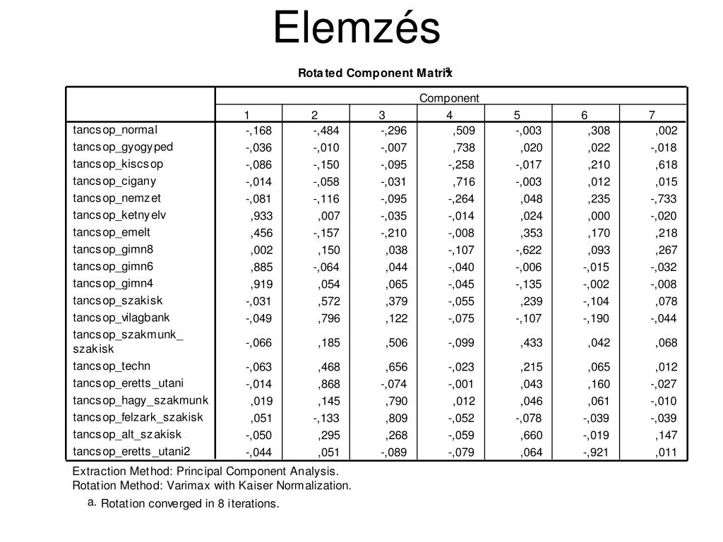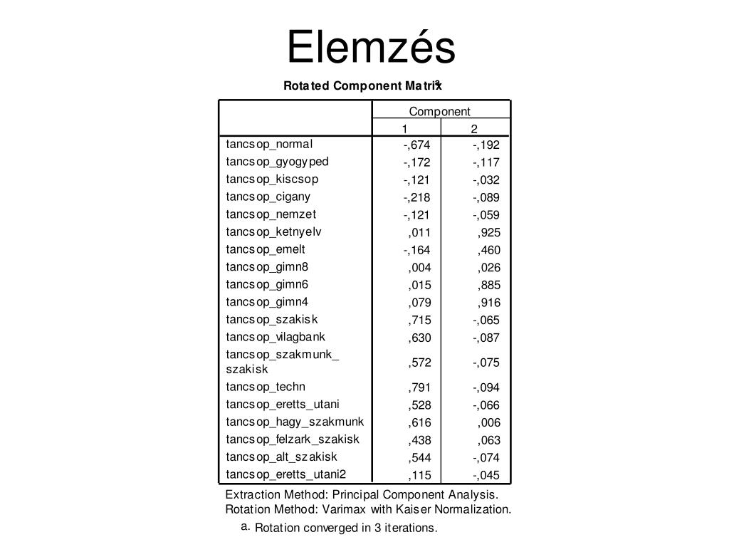 Varimax forgatás • A komponens mátrix elemeit úgy forgatjuk, hogy az oszlopokban a variancia maximális legyen, feltéve, hogy a főkomponensek továbbra is merőlegesek. • A forgatás numerikusan egy iteratív folyamat végeredménye