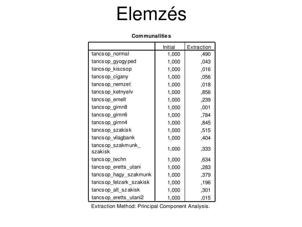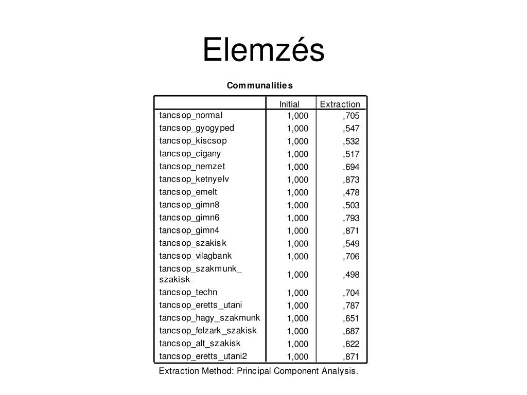 Előfeltételek • KMO (Kaiser-Meyer-Olkin) mutató: a változók közötti korrelációs együttható és parciális korrelációs együtthatókat vizsgálja. Ha a mutató értéke 0,5 felett van jelentős az összefüggés az adatokban. • Bartlett teszt: nullhipotézis: az elemzésbe bevont változók korrelálatlanok. A teszt előfeltétele a többdimenziós normális eloszlás.