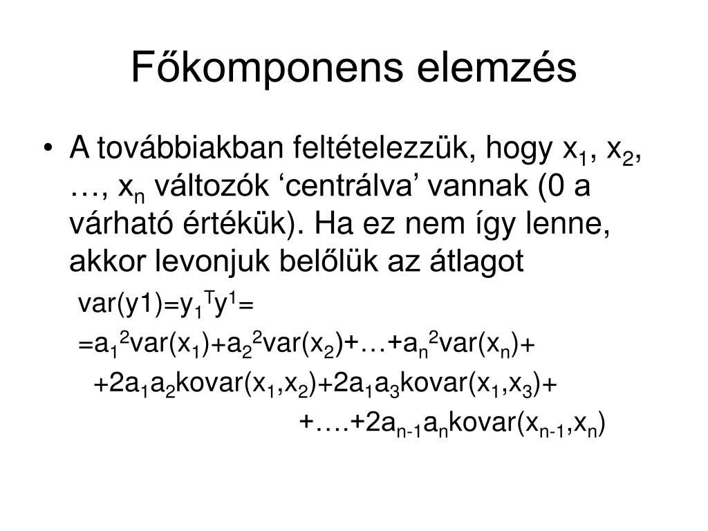 Főkomponens elemzés • A továbbiakban feltételezzük, hogy x1, x2, …, xn változók ‘centrálva’ vannak (0 a várható értékük). Ha ez nem így lenne, akkor levonjuk belőlük az átlagot var(y1)=y1Ty1= =a12var(x1)+a22var(x2)+…+an2var(xn)+ +2a1a2kovar(x1,x2)+2a1a3kovar(x1,x3)+ +….+2an-1ankovar(xn-1,xn)