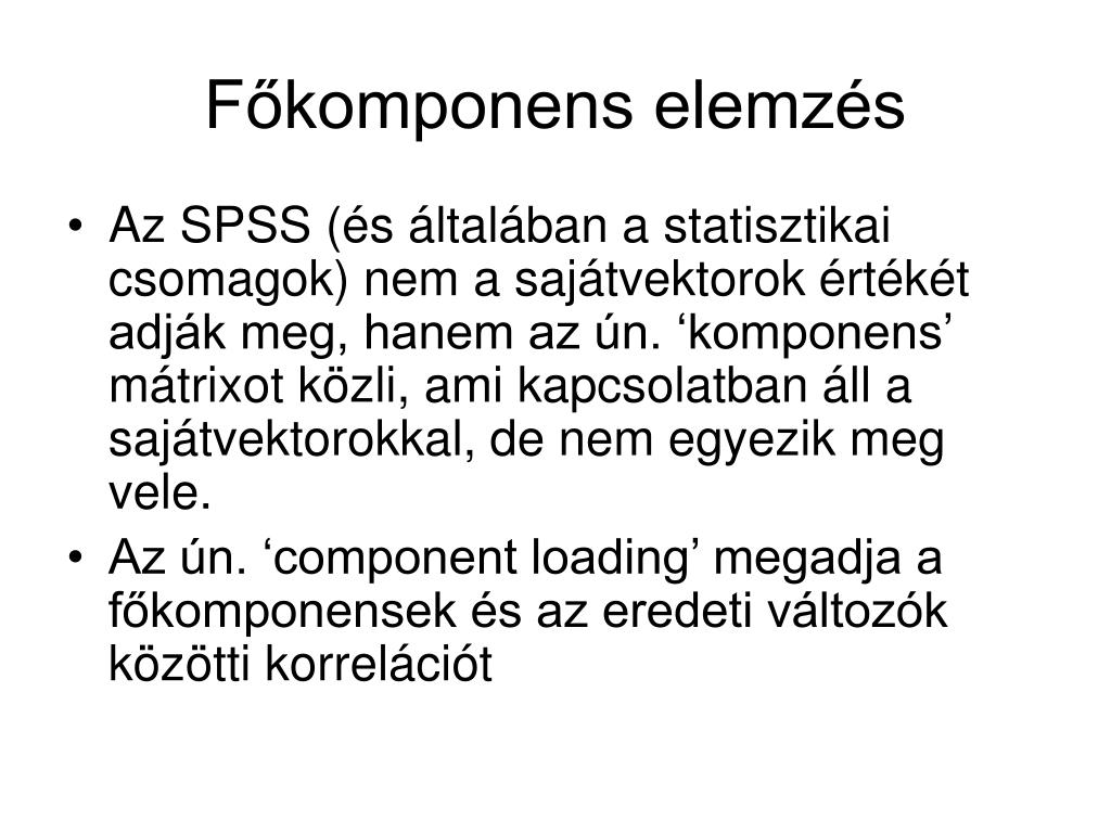 Főkomponens elemzés • Az SPSS (és általában a statisztikai csomagok) nem a sajátvektorok értékét adják meg, hanem az ún. ‘komponens’ mátrixot közli, ami kapcsolatban áll a sajátvektorokkal, de nem egyezik meg vele. • Az ún. ‘component loading’ megadja a főkomponensek és az eredeti változók közötti korrelációt