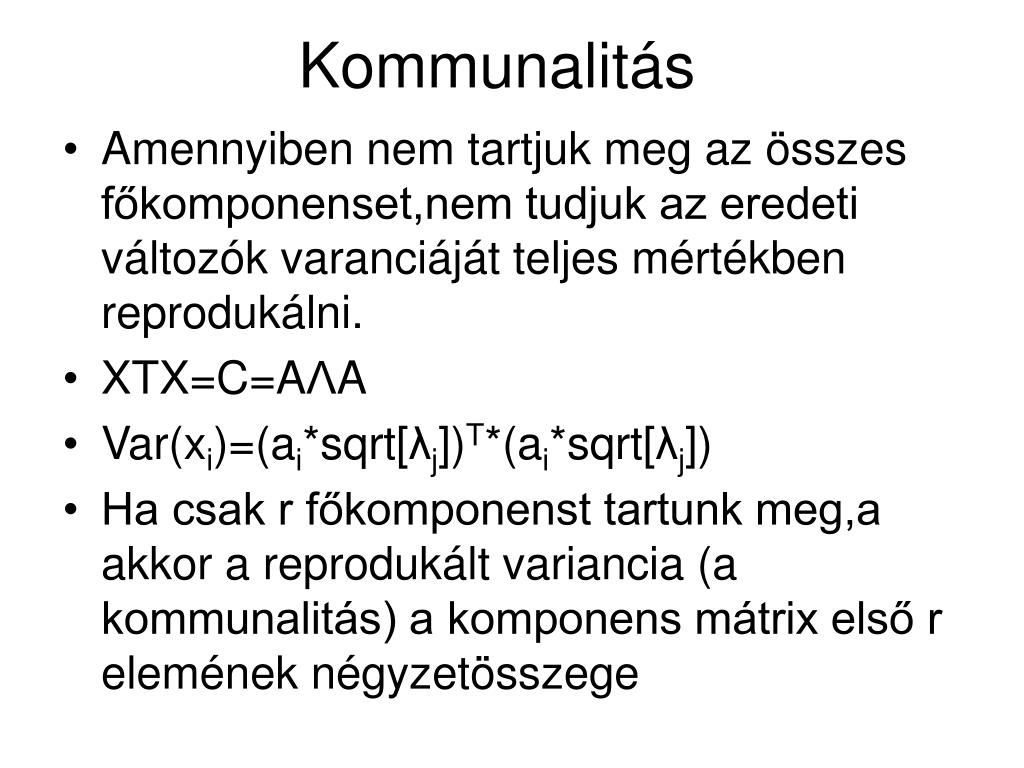 Kommunalitás • Amennyiben nem tartjuk meg az összes főkomponenset,nem tudjuk az eredeti változók varanciáját teljes mértékben reprodukálni. • XTX=C=AΛA • Var(xi)=(ai*sqrt[λj])T*(ai*sqrt[λj]) • Ha csak r főkomponenst tartunk meg,a akkor a reprodukált variancia (a kommunalitás) a komponens mátrix első r elemének négyzetösszege