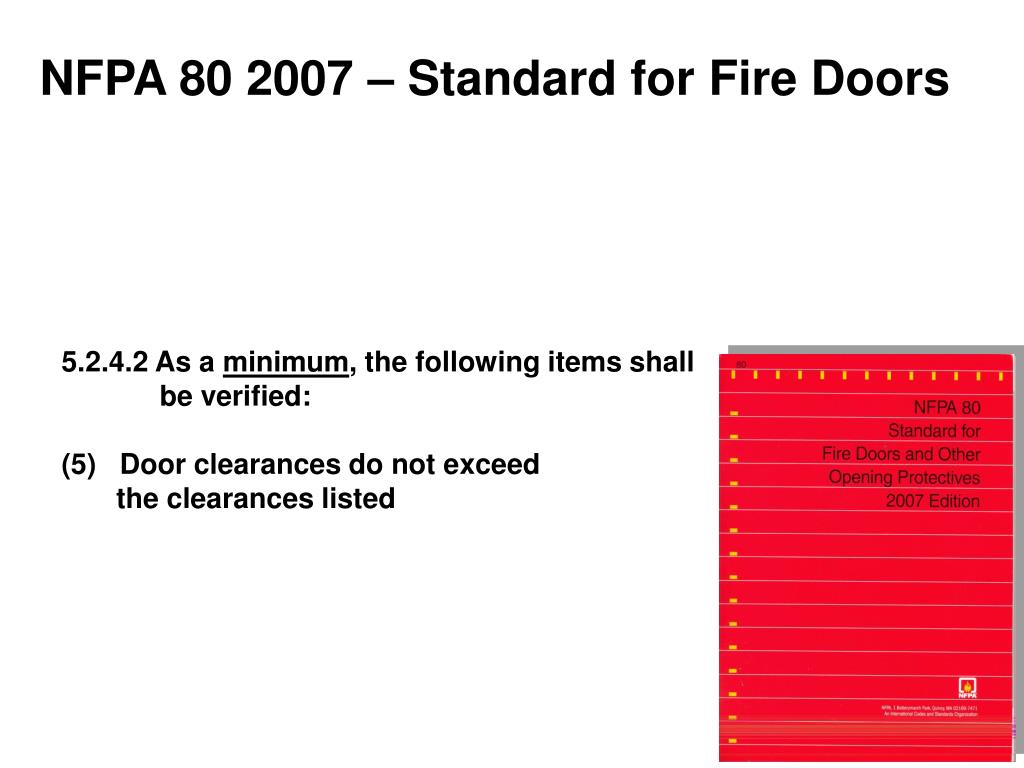 NFPA 80 2007 – Standard for Fire Doors 5.2.4.2 As a minimum, the following items shall be verified: (5) Door clearances do not exceed the clearances listed