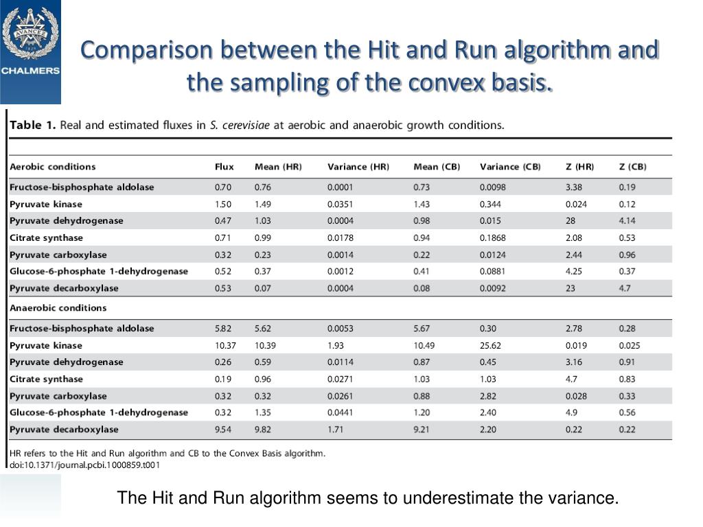 Comparison between the Hit and Run algorithm and the sampling of the convex basis. The Hit and Run algorithm seems to underestimate the variance.
