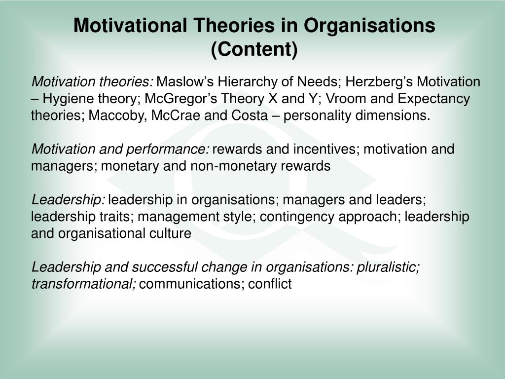 Motivational Theories in Organisations (Content) Motivation theories: Maslow’s Hierarchy of Needs; Herzberg’s Motivation – Hygiene theory; McGregor’s Theory X and Y; Vroom and Expectancy theories; Maccoby, McCrae and Costa – personality dimensions. Motivation and performance: rewards and incentives; motivation and managers; monetary and non-monetary rewards Leadership: leadership in organisations; managers and leaders; leadership traits; management style; contingency approach; leadership and organisational culture Leadership and successful change in organisations: pluralistic; transformational; communications; conflict