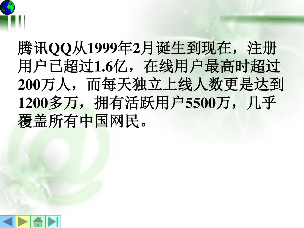腾讯QQ从1999年2月诞生到现在,注册用户已超过1.6亿,在线用户最高时超过200万人,而每天独立上线人数更是达到1200多万,拥有活跃用户5500万,几乎覆盖所有中国网民。腾讯QQ从1999年2月诞生到现在,注册用户已超过1.6亿,在线用户最高时超过200万人,而每天独立上线人数更是达到1200多万,拥有活跃用户5500万,几乎覆盖所有中国网民。