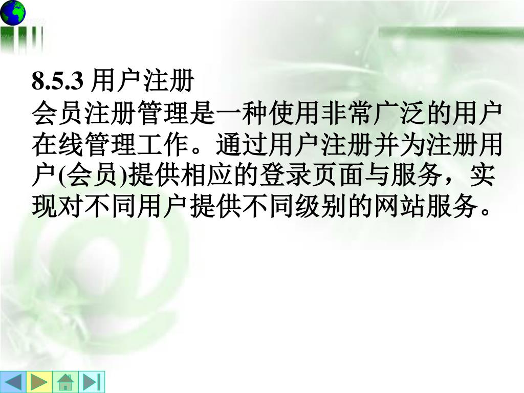 8.5.3 用户注册 会员注册管理是一种使用非常广泛的用户在线管理工作。通过用户注册并为注册用户(会员)提供相应的登录页面与服务,实现对不同用户提供不同级别的网站服务。